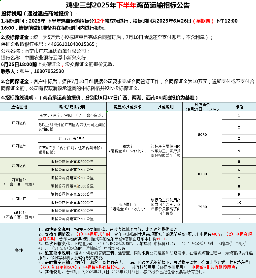 6.甲方应提前7天通知乙方鸡苗运输具体要求,以便于乙方提前做好安排,保证物流畅通,如计划临时变化和调整甲方应及时告知乙方。